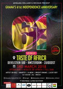 Akwaaba Holland and Representative Council of Ghanaian Organizations in The Netherlands (RECOGIN) will hold Ghana’s 61st Independence Party on Saturday 3 March, 2018 at Taste of Africa.